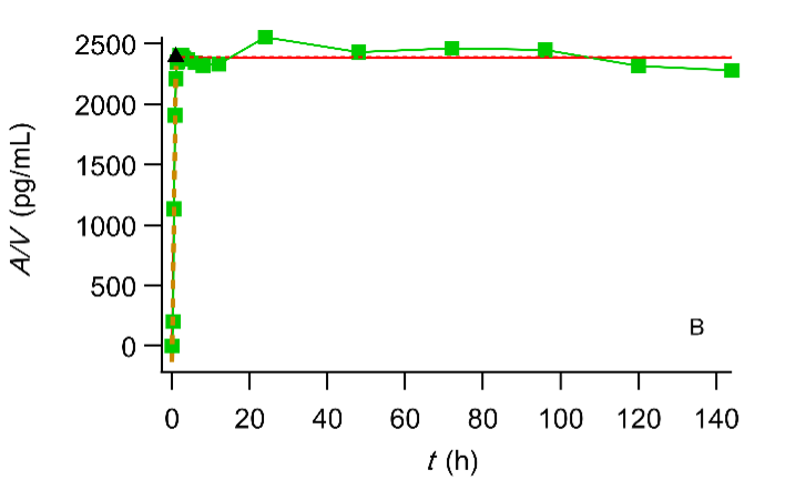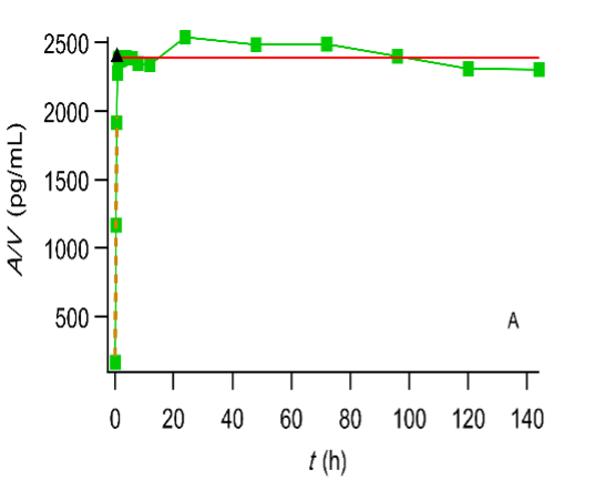 Plot of the cumulative amount of drug absorbed (expressed in terms of concentration) versus time. The symbol ▲ denotes the end of the absorption processes. Digoxin test (A) and reference (B) formulation administered to fasted volunteers (Data reported in (FDA. Center for Drug Evaluation and Research, Digoxin Bioequivalency Review 76268. 2002. https://www.accessdata.fda.gov/drugsatfda_docs/anda/2002/76268_Digoxin_Bioeqr.pdf)